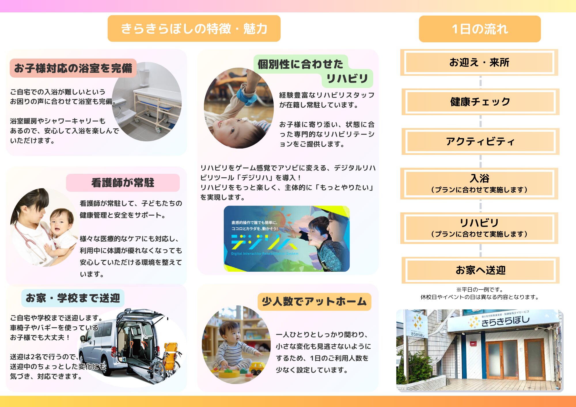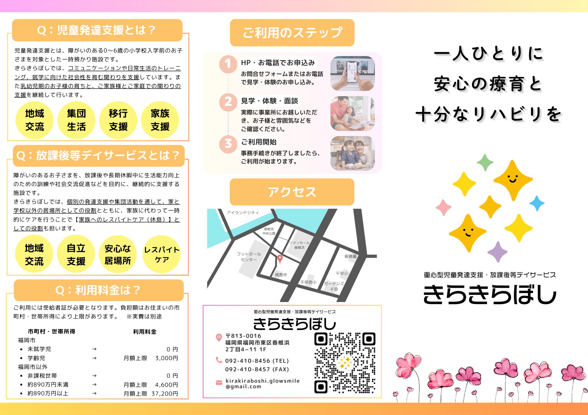 パンフレットができました! 2025 4/02 お知らせ ご報告 開設準備 2025年1月13日2025年4月2日 みなさんこんにちは、きらきらぼしです。 表題の通りですが、パンフレットができました! 初めてお会いする方々に、少しでもきらきらぼしのことをわかっていただけるように、できる限りわかりやすい内容に仕上げています。 もしどこかでこのパンフレットを見つけられたら、一度手に取っていただけると嬉しいです(^^) 公式Instagramのご紹介 kirakiraboshi_glowsmile 福岡市東区にある重症心身障害児を対象とした児童発達支援施設・放課後等デイサービス「きらきらぼし」の公式アカウントです。 日々の活動状況やイベントの告知、福祉関連の情報を中心に投稿していきます。 ▽お問い合わせはホームページからどうぞ! 最近、ピアノに触れることが増えてきた子ども達🎹✨ ピアノを指差し、自分から「弾きたい」という気 今日は、来週の節分に向けて鬼の的あて作りをしました。 段ボールにいろんな色の絵の具を手で塗ったり 炊いたご飯で、お煎餅🍘を作ってみました❗ 味付けは、砂糖醤油やごま油と塩✨️ 今回は、醤 またまた、寒くなってきましたね❄ 今回は、冬の感染症についてです😊 冬の後半は、寒さや乾燥が 子ども達と書き初めにチャレンジした時の様子です🖌️ 絵の具の時に使う筆よりも、持ち手や筆先が太 今月の壁面は、こちら!! 今回は、絵の具に霧吹きで水をかけ、手✋で広げながら塗りました🎨✨ みんなで、すごろくをしました! 普段は小さなカラーボールを投げて遊ぶことが好きな子ども達ですが 先日、名島神社に初詣へ行ってきました🐎✨ お出掛けということで、子ども達は向かっている車内からワ 明けましておめでとうございます! 2026年、新年が始まりましたね✨🎍✨ お正月は、ゆっ 今日で、今年最後の営業となりました✨ 振り返れば、4月からあっという間でした! 4月から 続きを見る フォローしてね★ お知らせ ご報告 開設準備 この記事が気に入ったら フォローしてね! Follow Me よかったらシェアしてね!